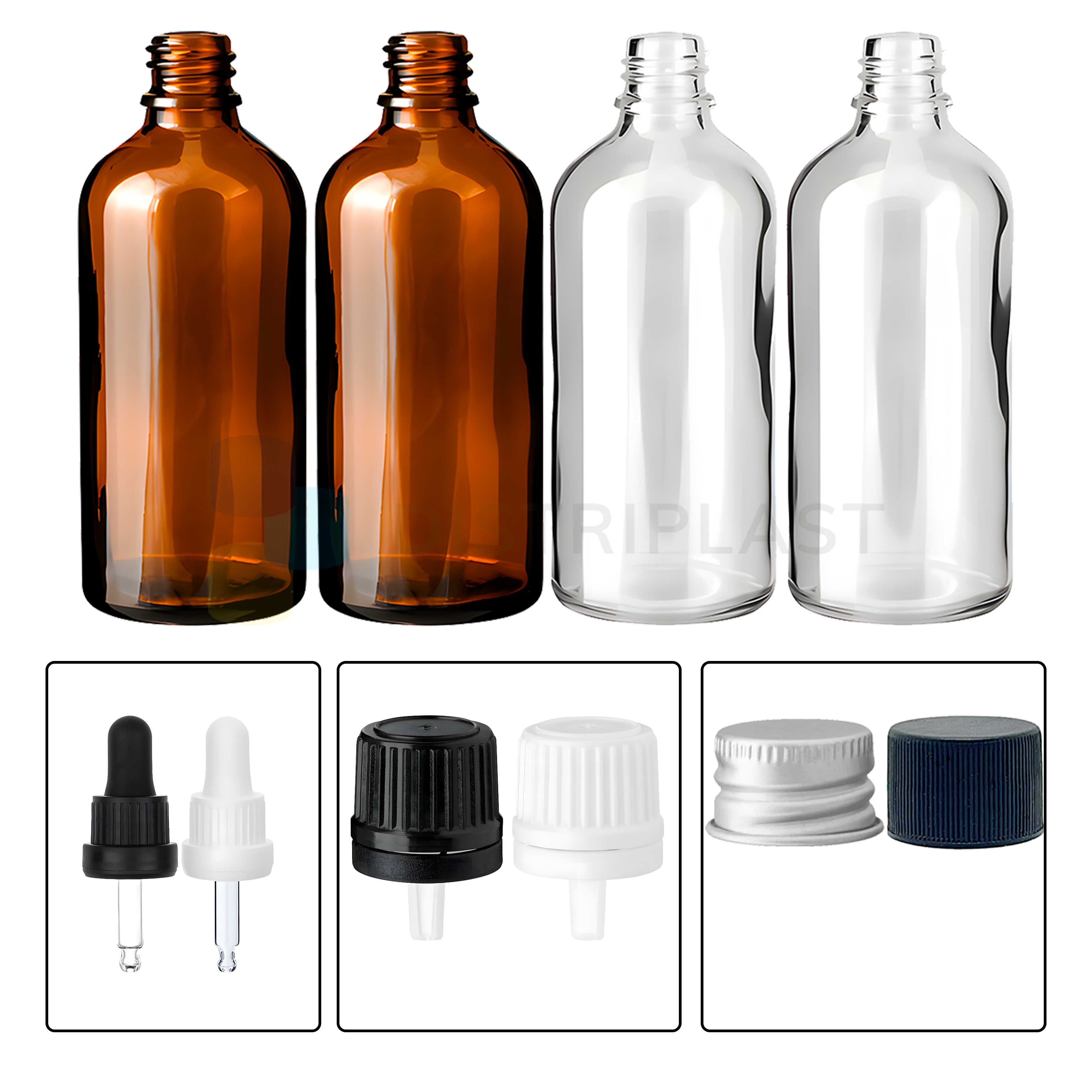 Gotero blanco, Gotero negro, Tapa rosca blanca con gotero invertido, Tapa rosca ciega con tapon antiderrame, Tapa rosca metalica con tapon antiderrame, Tapa rosca negra con gotero invertido